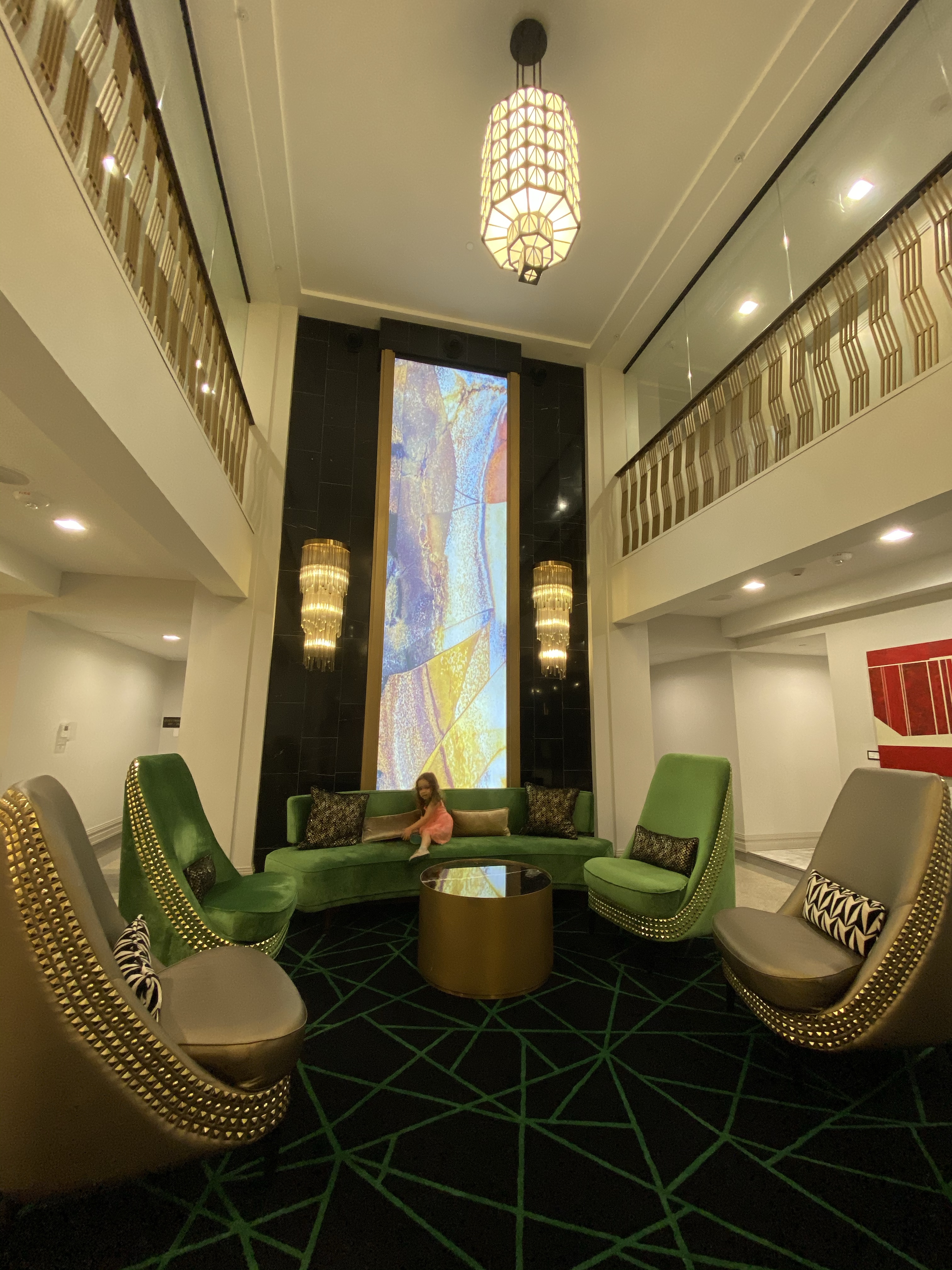 After the initial shock of the missing suitcase wore off, Sheri needed a few minutes (i.e. hours) to decompress. As Sheri and Adam got the rest of their luggage, Sepp and Erinn took Maia with us to the bar to get drinks. Our hotel was very 1920s / Art Deco with decorative high back golden spike-studded chairs and softly-lit chandeliers.