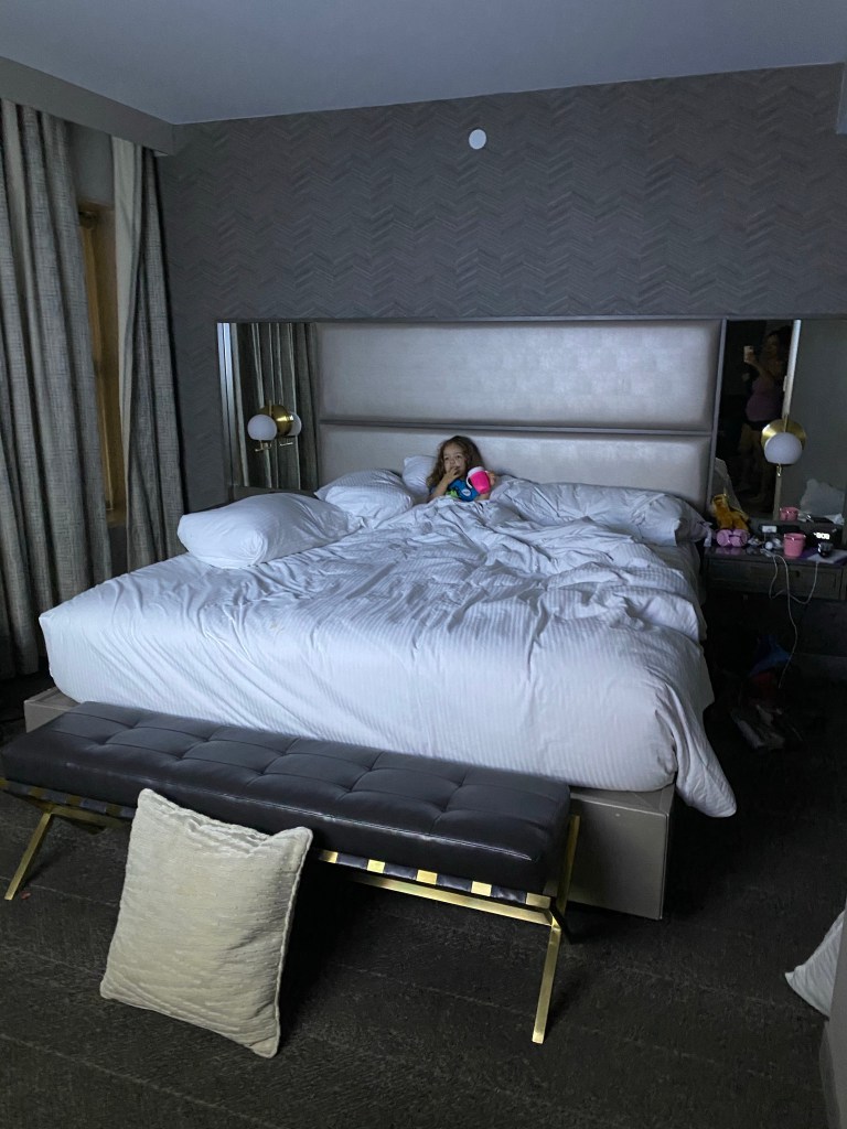 No trip is without it’s hiccups, and this one was no exception. As soon as we began unpacking our bags outside the hotel, we realize that Sheri is missing her large TUMI hard shell suitcase. *Scratches head*… Where could the suitcase be? Did we leave it at the campground in Arkansas? Sheri called the campground to see if she left it there, and unfortunately they didn’t see it 😦