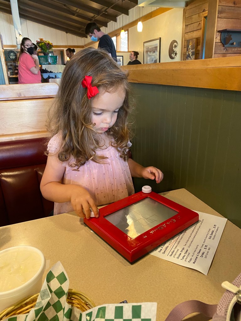 The traffic in Twin Falls was reminiscent of the DC area, and one of the reasons we left. The drivers were pretty aggressive, too. We enjoyed a comforting meal of fried brunch food (except for Maia – she discarded the outside of the corndog just to eat the hot dog on a stick), serenaded by the clamor of the cook scolding the servers. Our server was super sweet though and obsessed with Maia’s curls, dress and cowgirl boots.